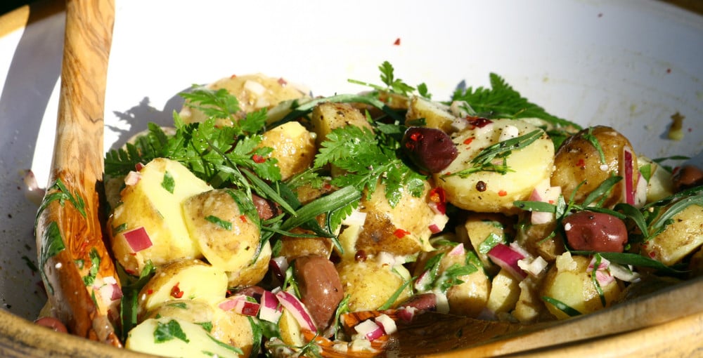 - Räuchertofu oder vegane/vegetarische Wurst ersetzen den Schinken, der traditionell in den Salat gemischt wird.