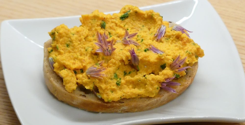 VeganKürbis-Hummus besteht aus Hummus und gekochtem Kürbis beziehungsweise Kürbispüree. Durch die Zugabe von Gemüse ist er etwas leichter als reiner Kichererbsenhummus.