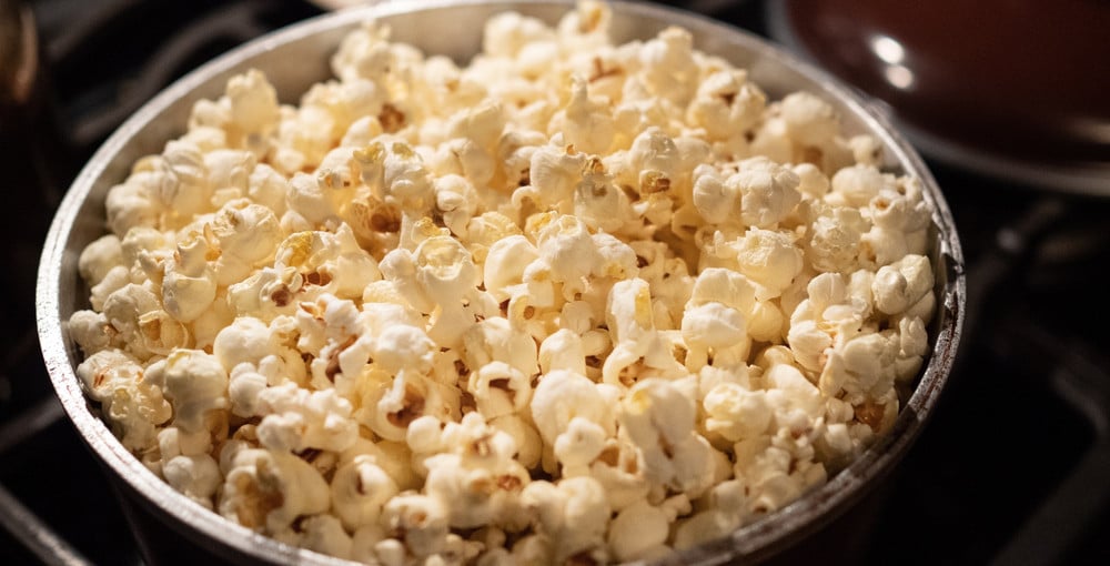 Füge den Popcornmais hinzu und setze den Deckel auf den Topf. Schüttle den Topf gelegentlich leicht, sobald die Körner zu platzen beginnen und höre damit erst auf, wenn das Platzen aufgehört hat. So verhinderst du, dass das Popcorn anbrennt.